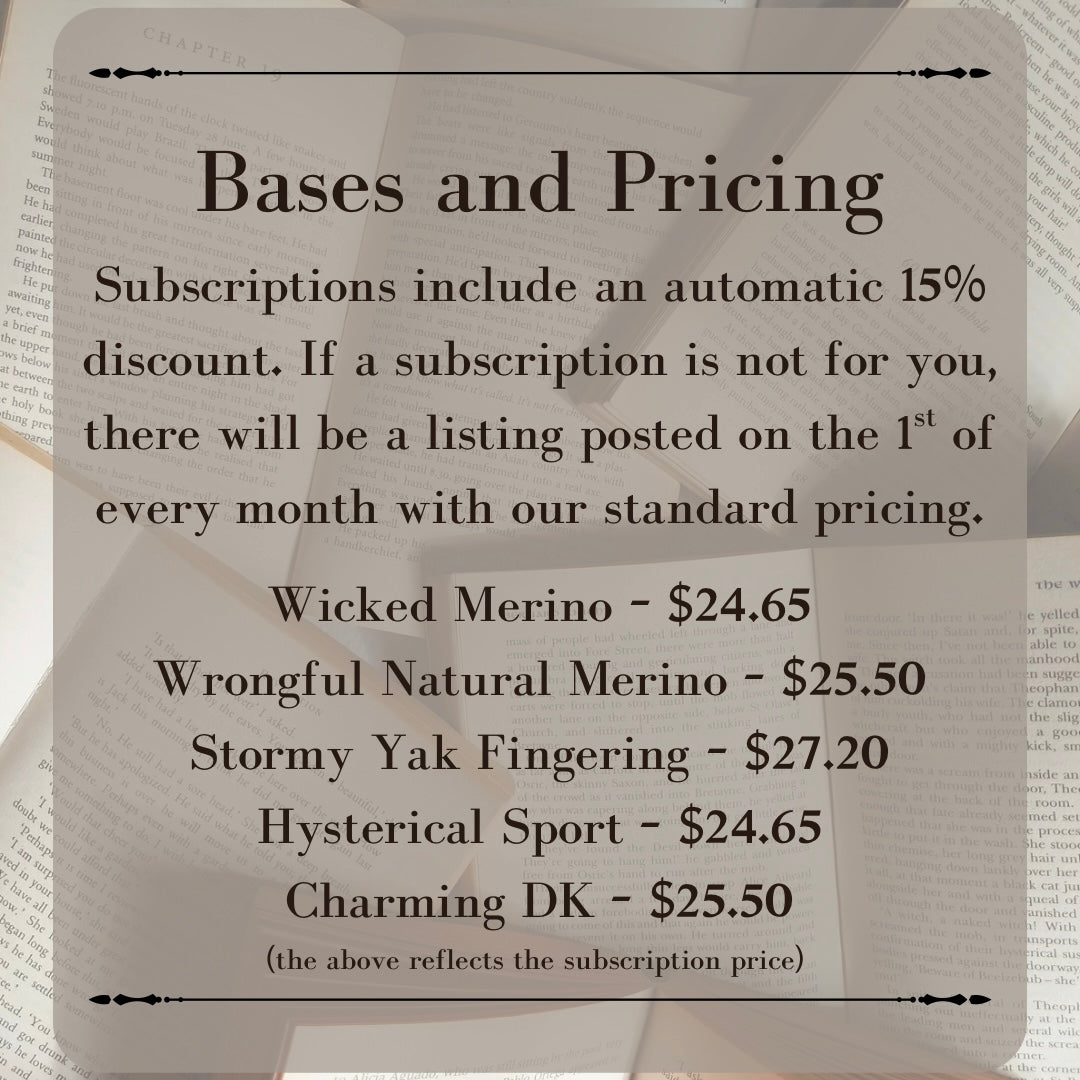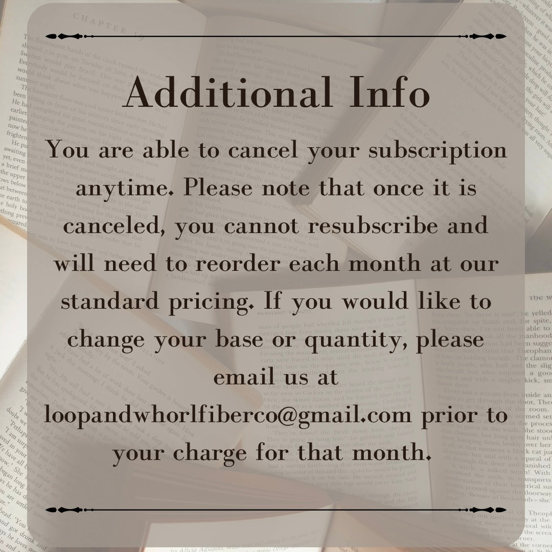 Purchasing a subscription for the year of Bookish Club will give you a 15% discount on your yarn. The subscription will be billed monthly, and you can cancel the subscription later if you change your mind. Feel free to message us with any questions about the subscription option, or if you'd like to change your subscription for an upcoming monthly colorways :) The individual skeins do not include a discount, and they will not auto-renew, so there are no obligations for future payments. If you have a subscription, you may add on as many individual skeins as you'd like to an existing subscription, and we will ship them all together and honor your discount by issuing a partial refund for the extra skeins.